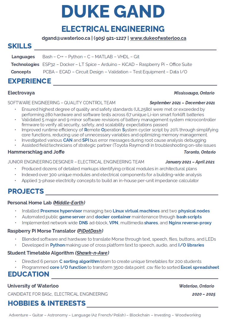Now, as a new grad of Electrical Engineering from the University of Waterloo, the passion and spark that was ignited in my youth has grown exponentially. Through coursework, student societies & design teams, and personal projects I have developed my grit and engineering knowledge in ways I would have never imagined.